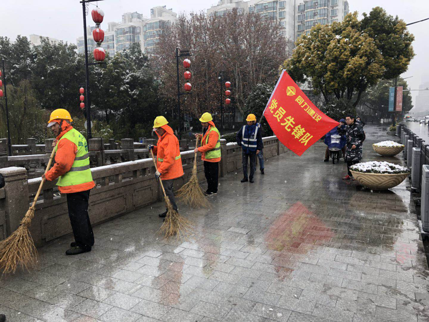 龍蟠中路項目部第一時間啟動掃雪應急預案,要求全體管理人員停止休假返崗,積極組織并參與掃雪除冰、保障群眾安全暢通出行工作。