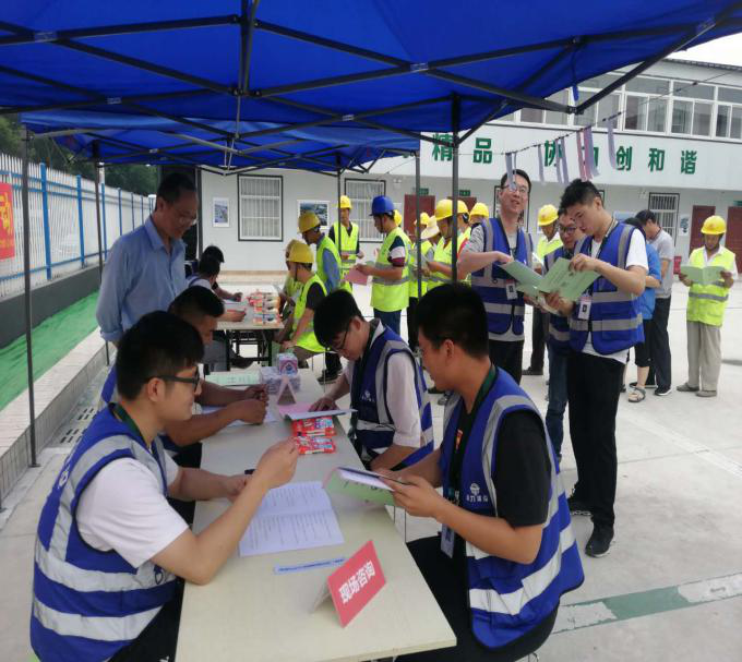 “經常性的安全教育起什么作用?”在現場宣傳位上,領導班組及安全部人員正采用快問快答的方式和現場施工人員趣味互動、有獎問答。通過回答問題,了解安全生產知識,并可獲得相應與安全生產的宣傳資料。