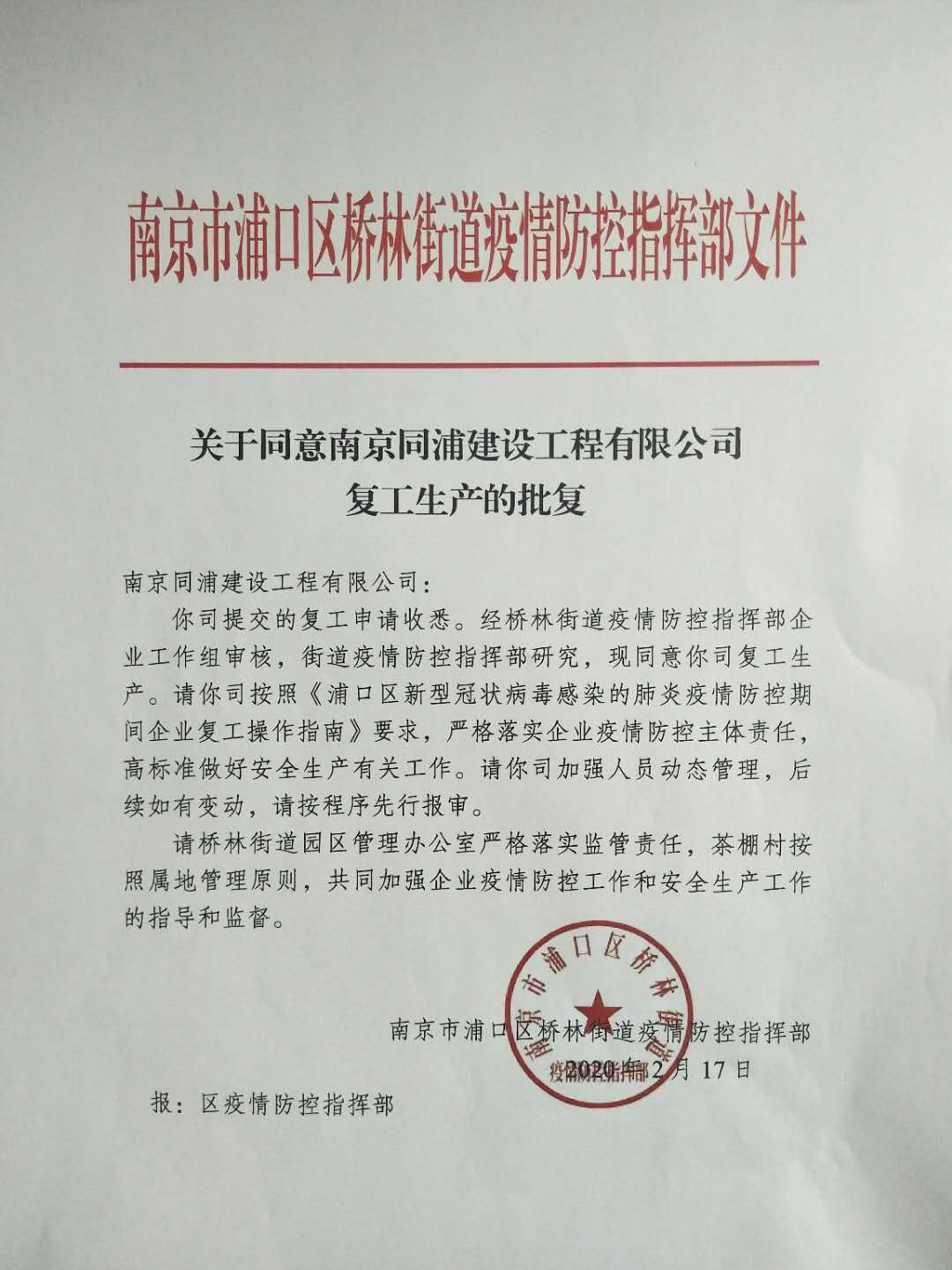 在同力建設(shè)領(lǐng)導的關(guān)心指導下,同浦公司魏強董事長親任同浦公司防疫工作領(lǐng)導小組組長,同浦公司總經(jīng)理徐雪華任副組長,自2月2日起,按照屬地政府橋林街道園區(qū)辦的復工政策要求,全面組織準備各項防疫物資、復工申報材料,2月10日正式提交復工申請。經(jīng)多方努力跟進,2月17日,同浦公司取得復工批復,為茶棚工業(yè)園區(qū)第一家復工企業(yè)。